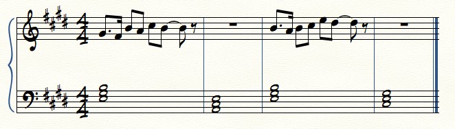 In this case, space is tight – which means constant flow. Also, the response has its own unique shape while staying within the chordal tones. These are some nice qualities. However, there are breaks of silence between that can be abrupt. So, by incorporating an anticipating figure, and modifying the rhythm to look similar to the call, the response is workshopped into something completely better than before: