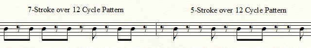Below is the 12 pulse cycle broken in a 5+7 asymmetry. The measures on the left show the 7 strike pattern, while the left shows the 5 strike pattern. Notice how they complement each other. While these patterns are intended for a single instrument, a percussion part of two distinct pitches can play these opposing patterns.