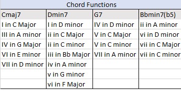 Below is a “cheat-sheet” of common chords found in music and the possible diatonic harmonic functions found in various keys:
