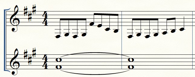 Finally, add sixteenth-notes in between. These notes should be chromatic notes outside of the key; however, they can also be diatonic notes so long as the fit the direction of the moving melodic line: