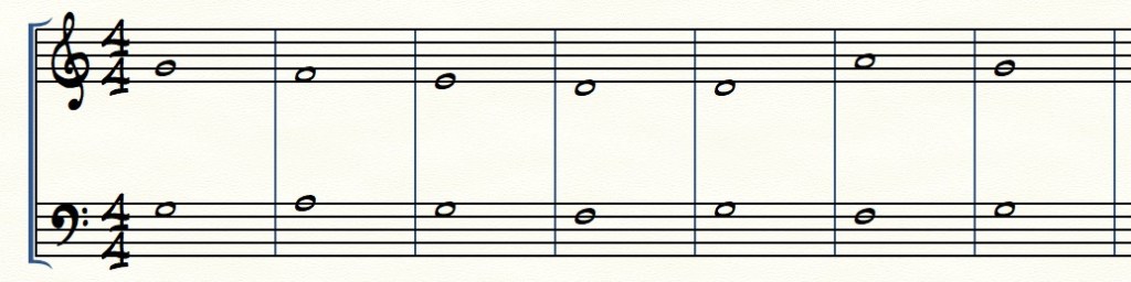 We will do the same with first species counterpoint, or “note-against-note” counterpoint where the ratio of notes between the and the newly added line and cantus firmus is 1:1. It should look something like this: