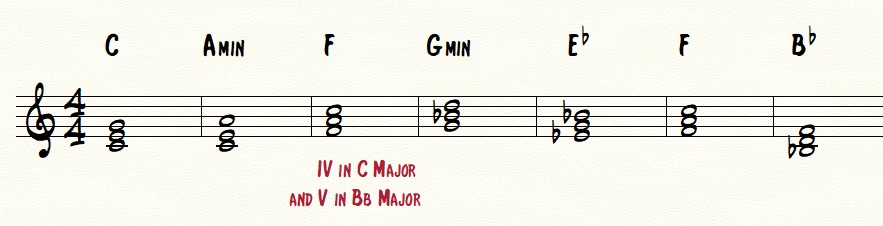 Notice how the F major triad is a chord in two keys: C Major and Bb Major. With the F major triad having multiple functions, we can direct the harmonic progression into a new key area.